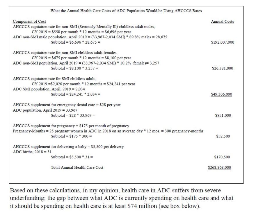 Recognizing that this comparison had limitations, Stern says he then turned to the Arizona Health Care Cost Containment System (AHCCCS) to judge the adequacy of ADC’s health care spending.