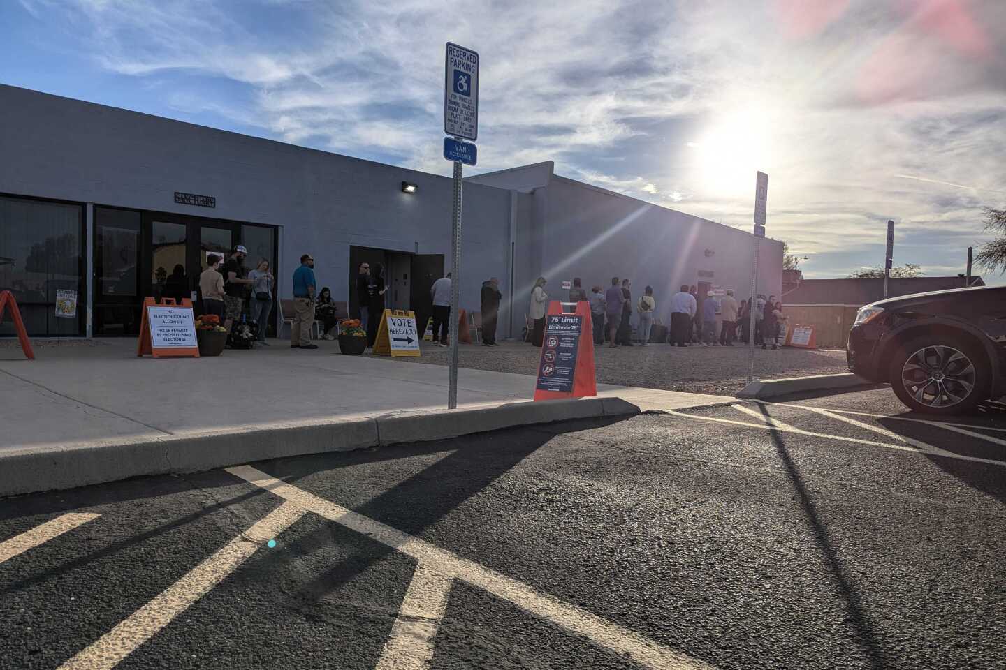 Voters in line on Nov. 5, 2024, at a vote center near 15th Avenue and Beardsley Road in Phoenix. (Sky Schaudt/KJZZ)