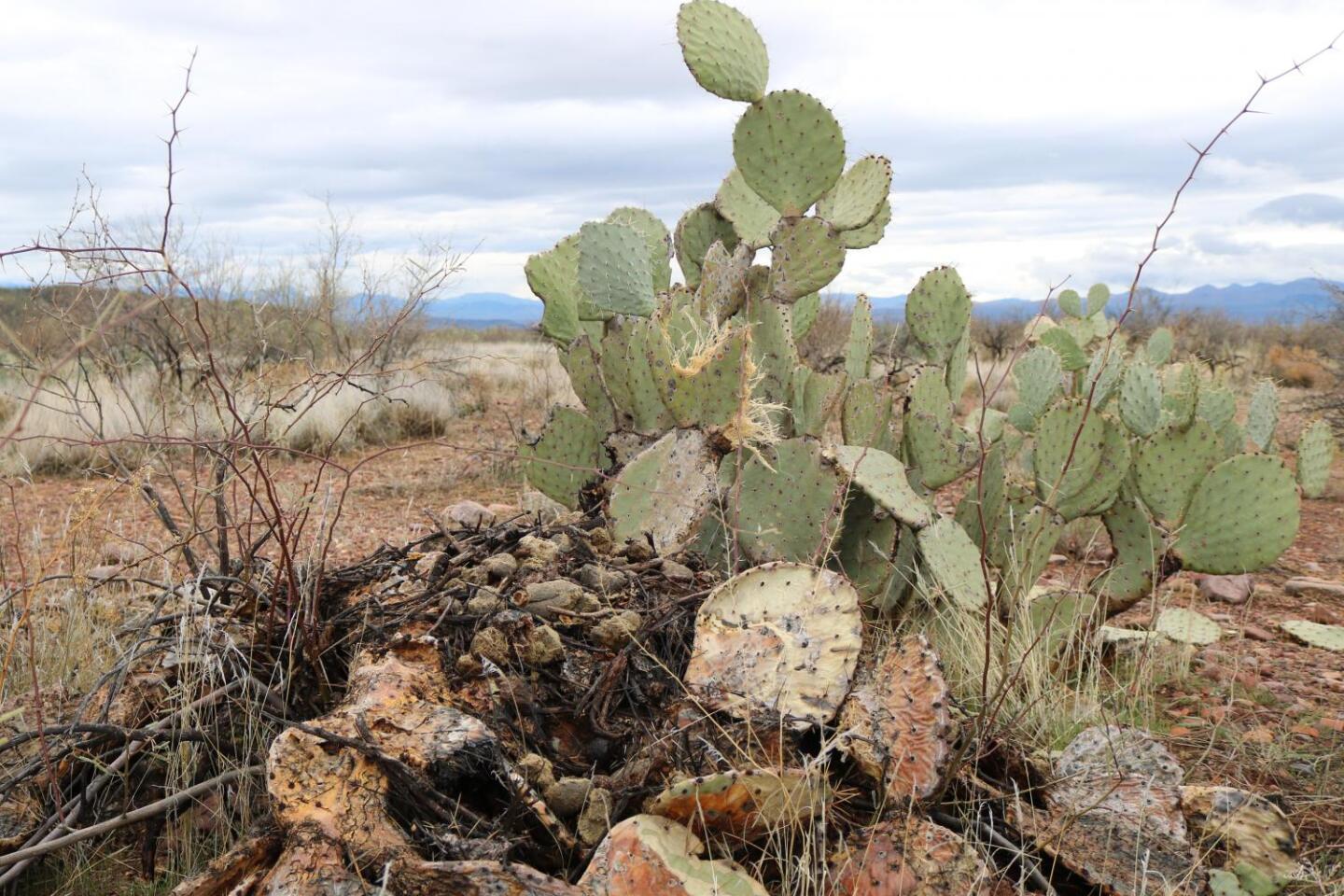Packrat mansions, like this one, are made from heaps of decaying leaves and feces underneath the root systems of cacti and agave. (Gabriel Pietrorazio/KJZZ)