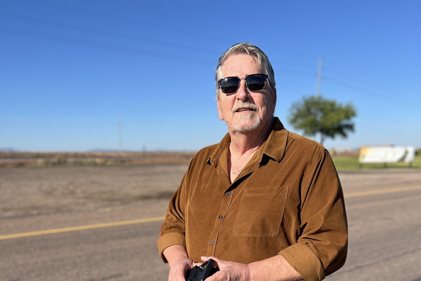 Winslow Chamber of Commerce CEO Bob Hall stands next to the rumble strips the chamber had installed on Route 66. (Michel Marizco/KJZZ)