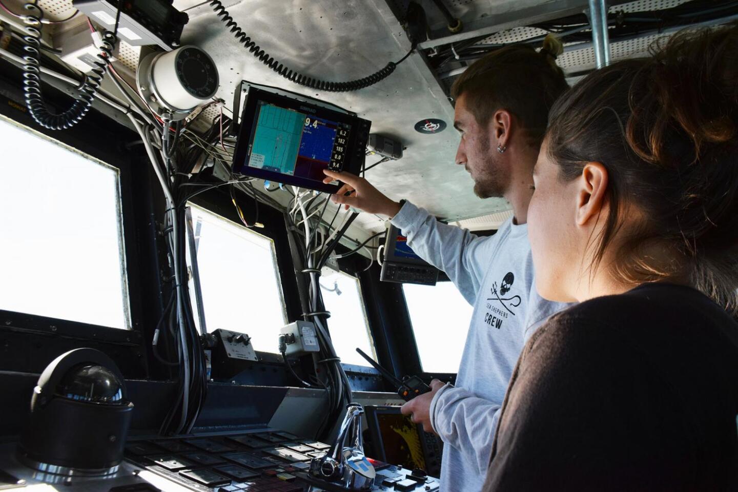 Sea Shepherd crew members Volcy Boilvein and Jorge Amaya see what might be an abandoned net on the ship's sonar. (Kendal Blust/KJZZ / editorial | staff)