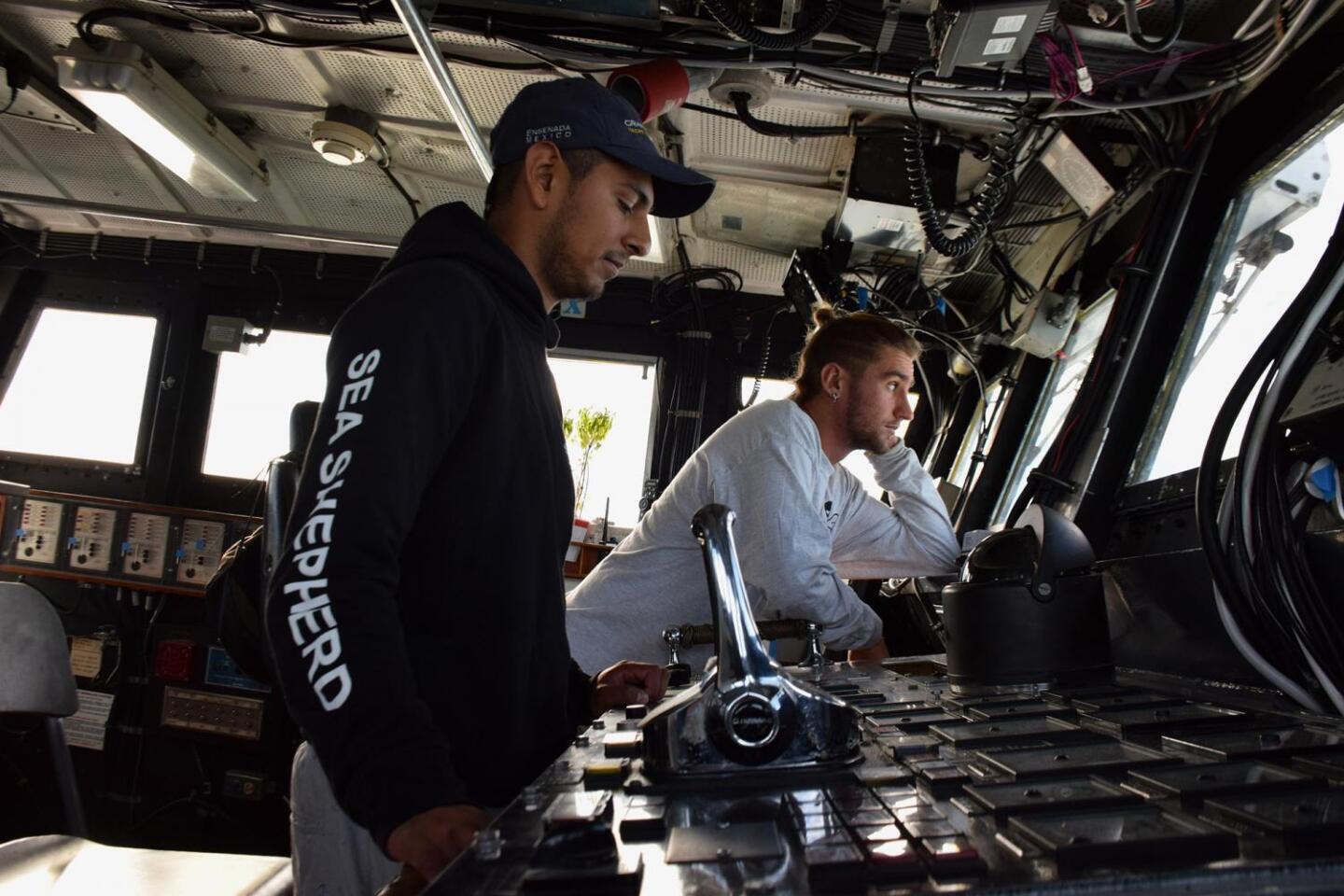 From left, Sea Shepherd crew members Ivan Silva and Jorge Amaya pilot the ship. (Kendal Blust/KJZZ / editorial | staff)