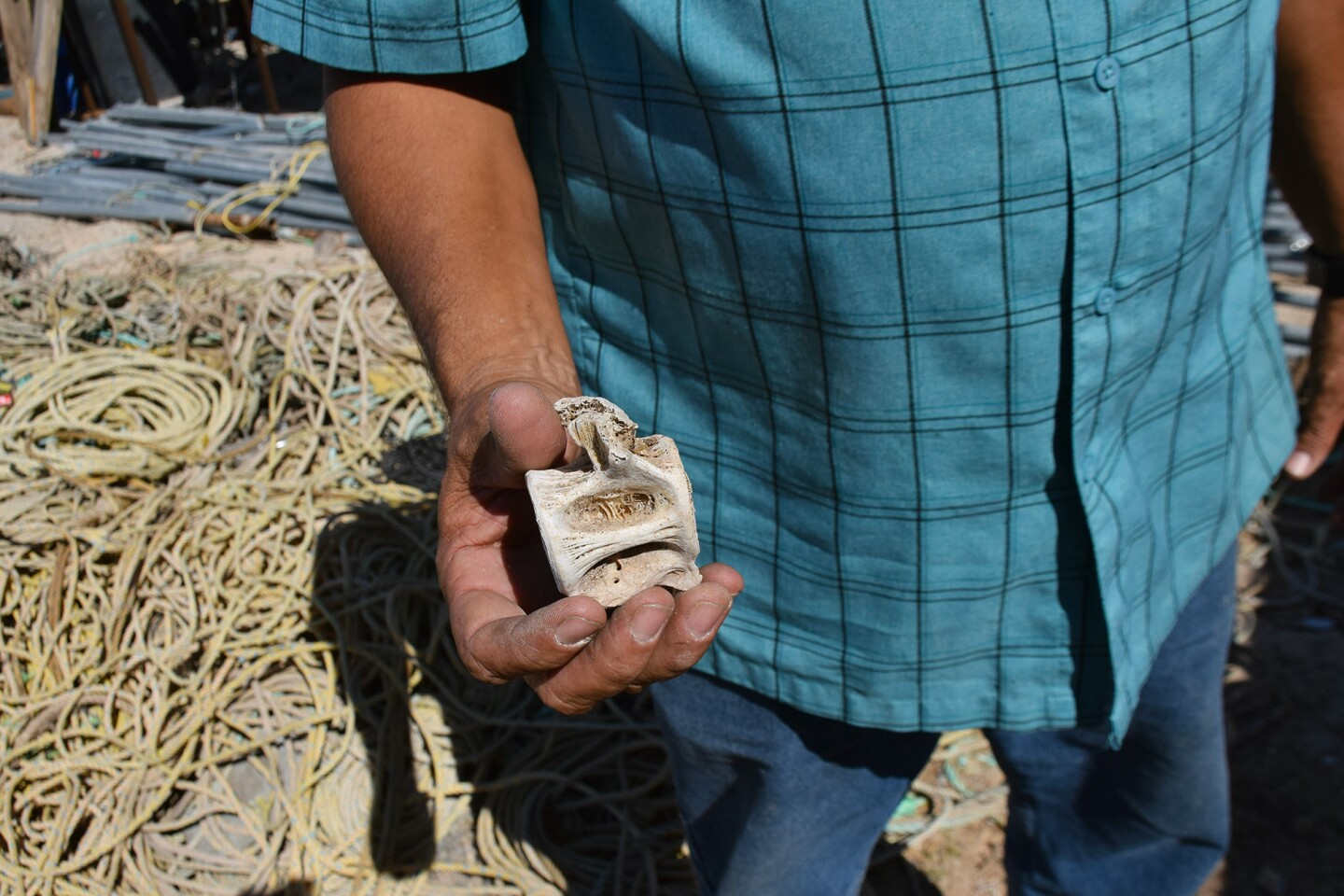 A fishermen holds up a bone found in a gillnet pulled from the vaquita refuge. (Kendal Blust/KJZZ)