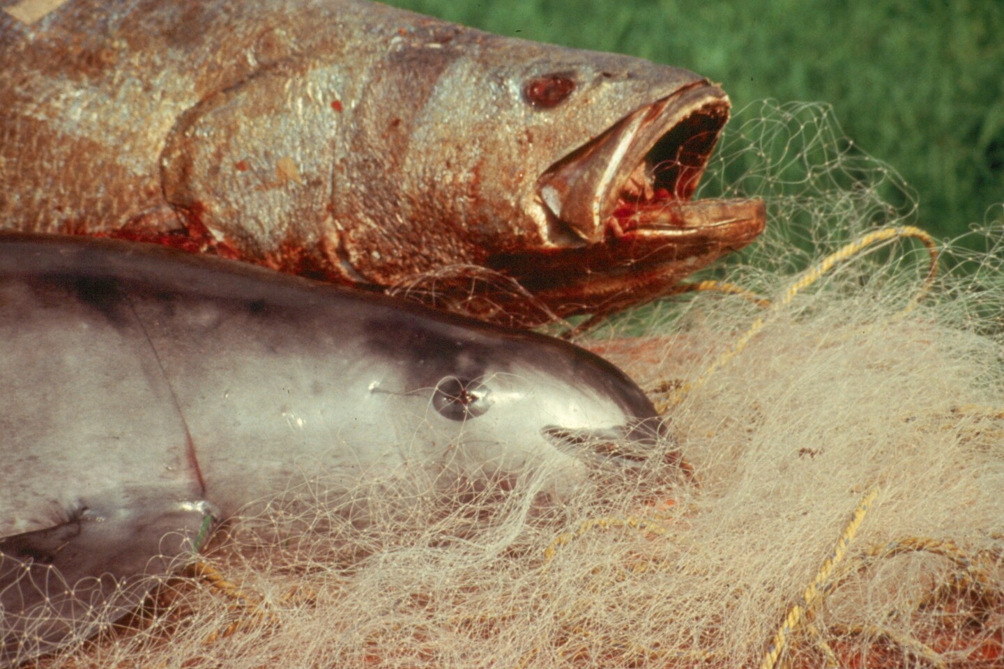 A vaquita and a totoaba shown side-by-side. Because of their similar size, gillnets designed to catch totoaba easily ensnare the vaquita, too. (Omar Vidal/Proyecto Vaquita (1992) / handout | agency)