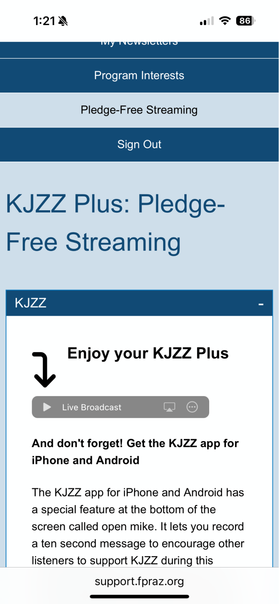 Once logged in, click the “Pledge-free Streaming” link at the top of the page. On the KJZZ Plus page, click the play button in the audio player and enjoy the pledge free stream.